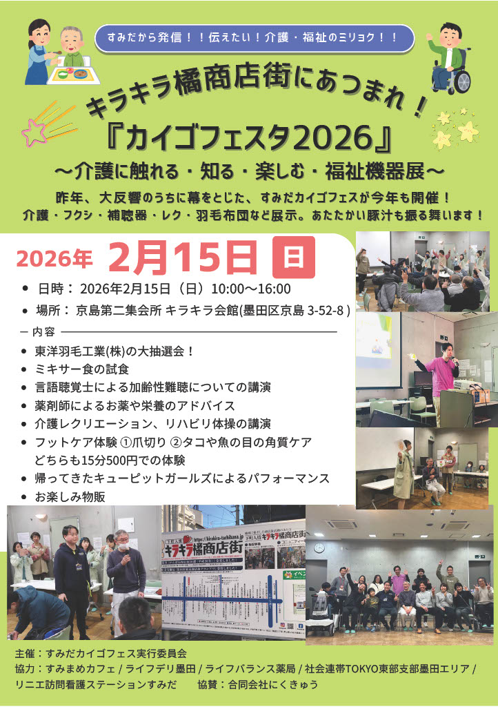 2月15日(日)10時~16時 京島第2集会所(キラキラ会館)にて、すみだカイゴフェスタを行います。