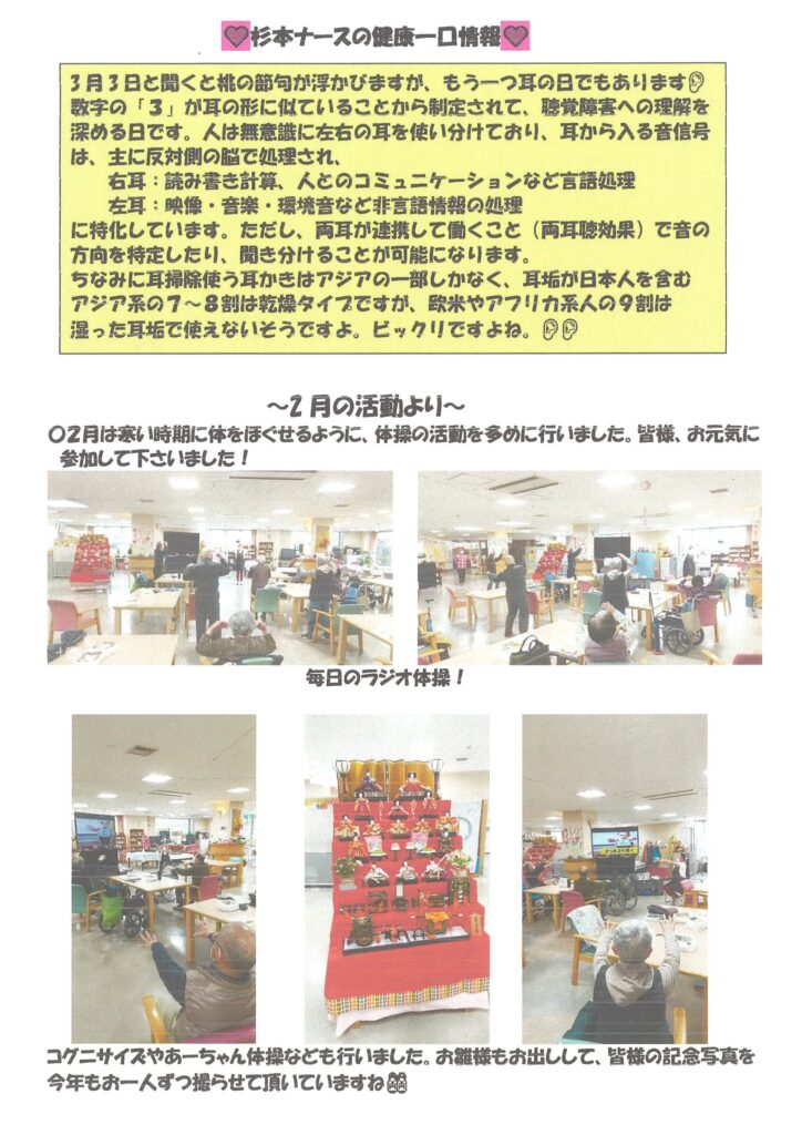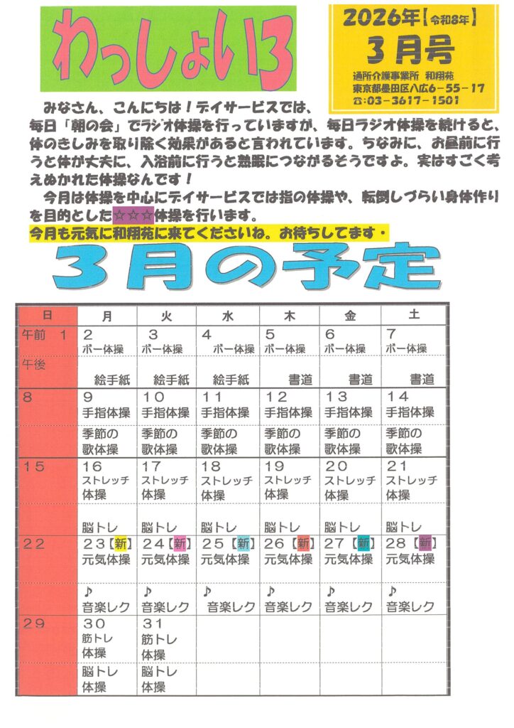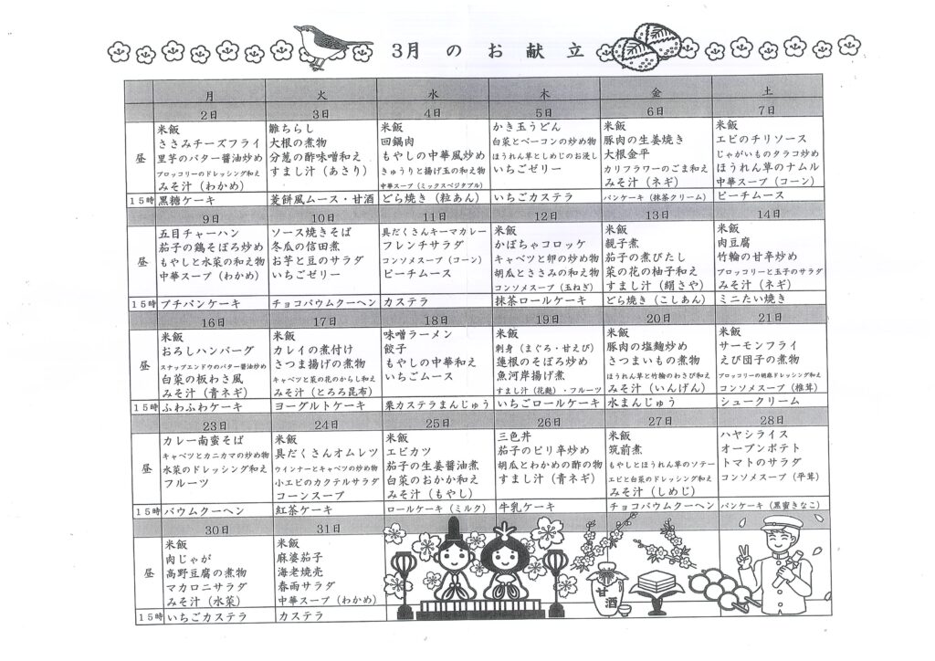 在宅サービス(デイサービス、ショートステイ、訪問介護)の空き情報! こちらのページでは空き情報を随時更新していきます。 デイサービス3月の活動予定表と献立表を更新しました。空き情報もご一緒に是非、ご覧ください。 ご見学(ご状態に応じての体験ご利用も)などのご相談も、是非お待ちしております! ヘルパーステーション和翔苑の空き情報です。