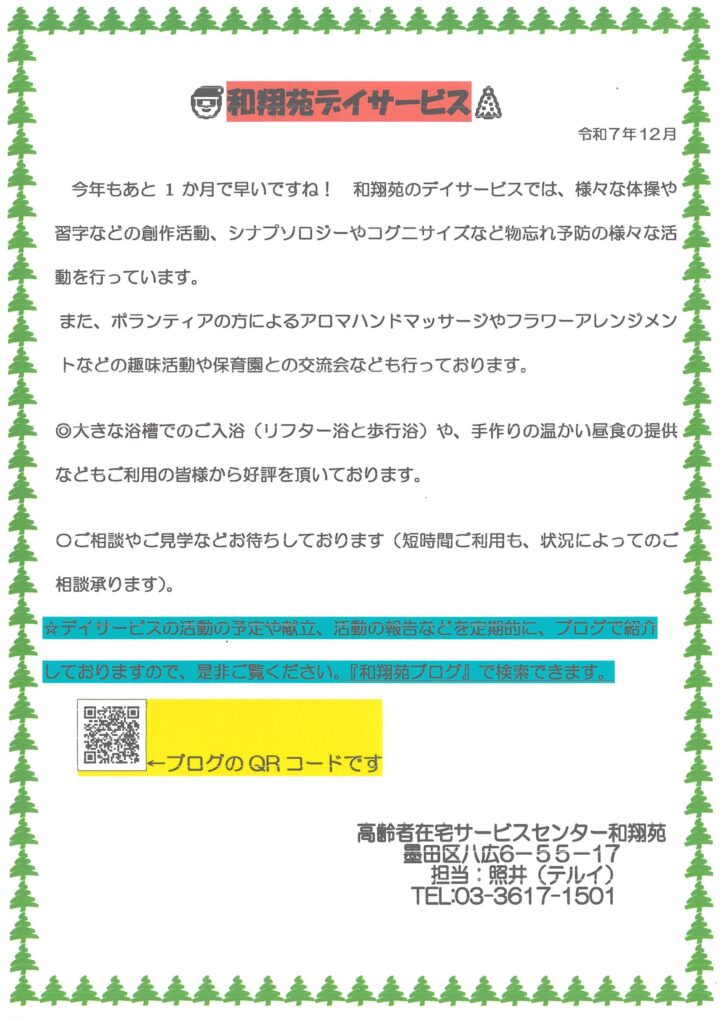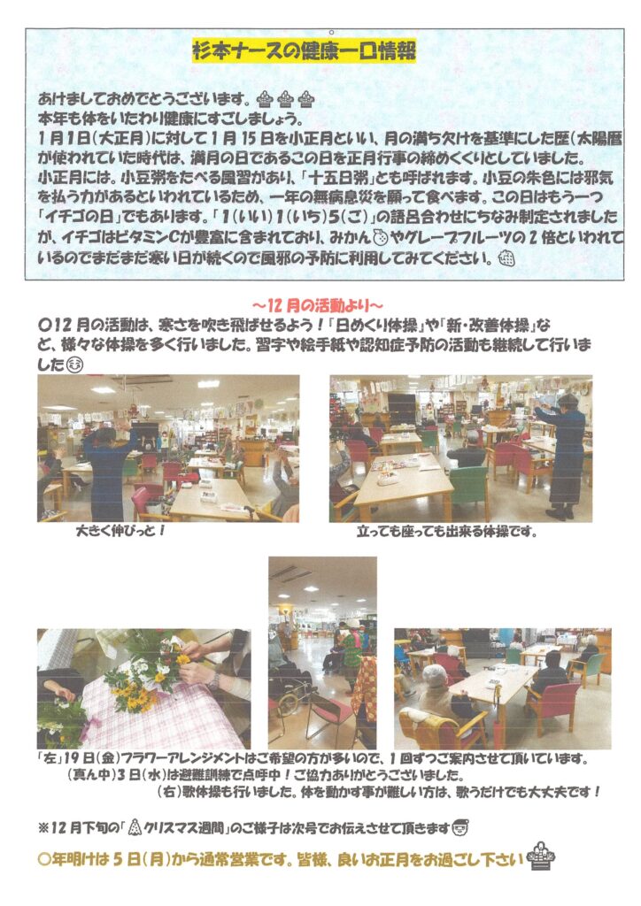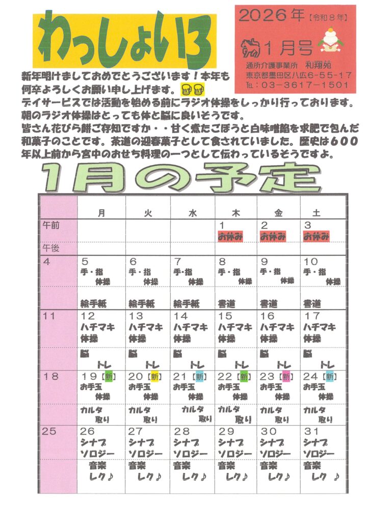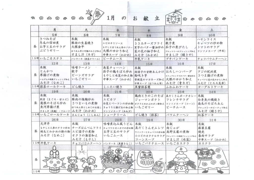 デイサービス1月の活動予定表と献立表を更新しました。空き情報もご一緒に是非、ご覧ください。