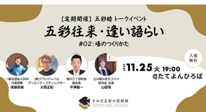 五彩睦トークイベント「五彩往来・逢い語らい」とは、来年度墨田区で開催される「すみだ五彩の芸術祭」に向けて、地域と関わりながら学び、作り上げていく、連続トークイベントです。
